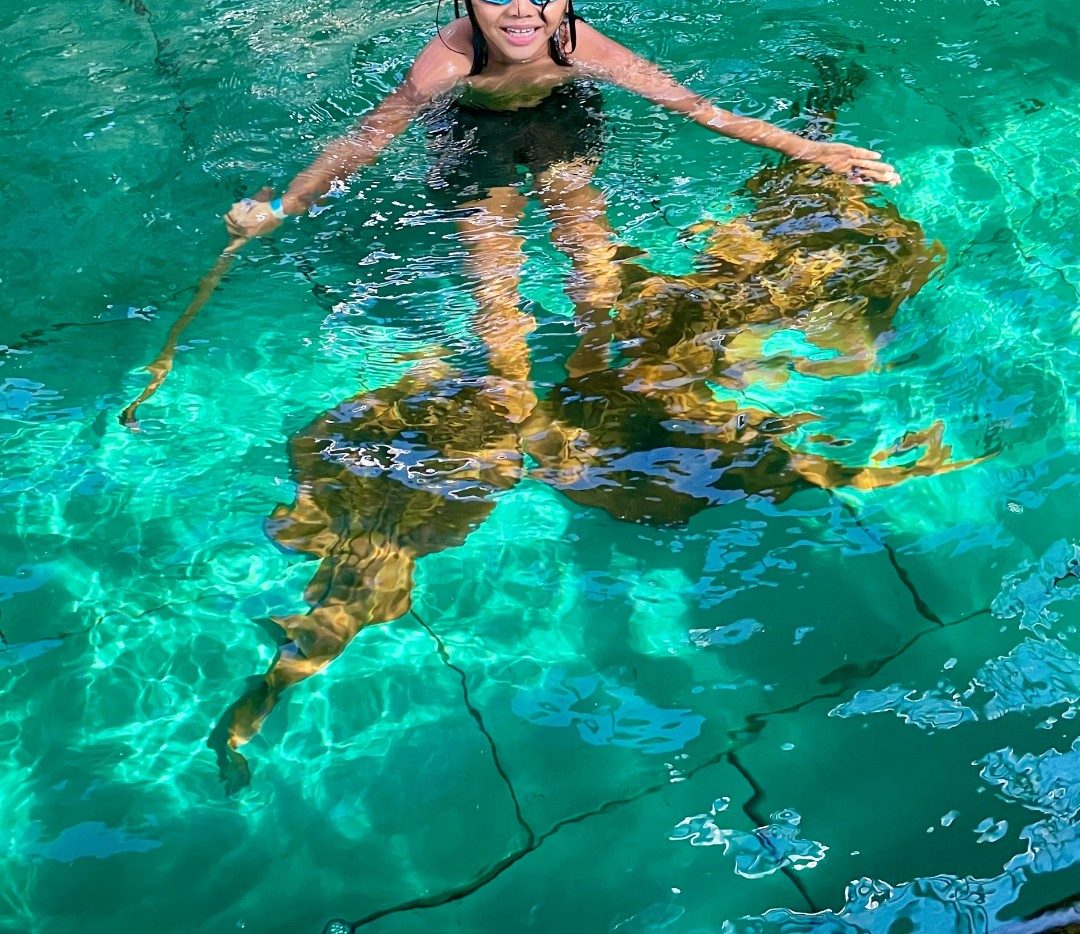 Eagle Rays are true acrobats of the ocean, gliding effortlessly through the water with their elegant, diamond-shaped bodies and long, graceful tails. These gentle giants are not only stunning to watch – they absolutely love a cuddle! In fact, they are known for being social and curious, often approaching humans during supervised encounters. Found in warm oceans around the world, Eagle Rays play an important role in the reef ecosystem by helping control populations of mollusks and crustaceans.
